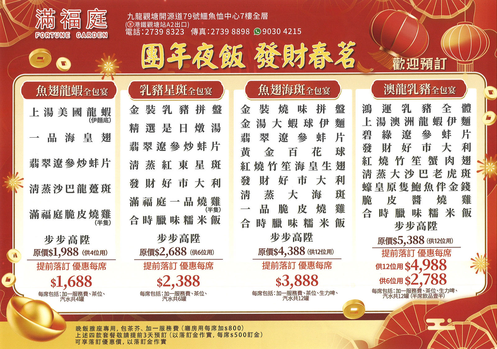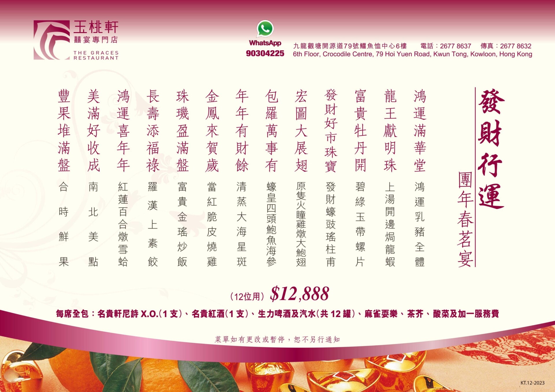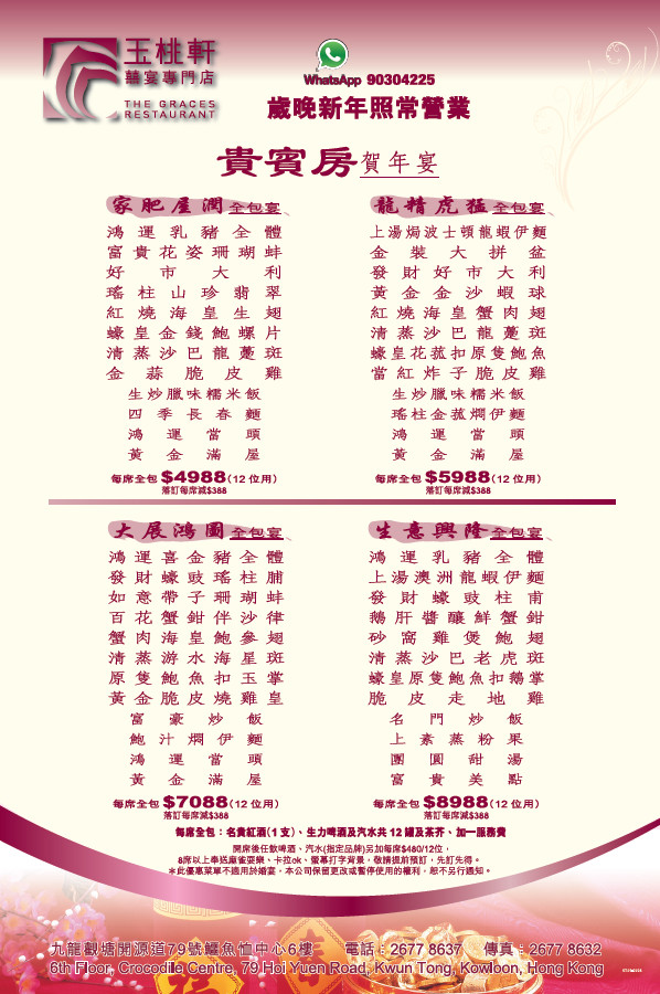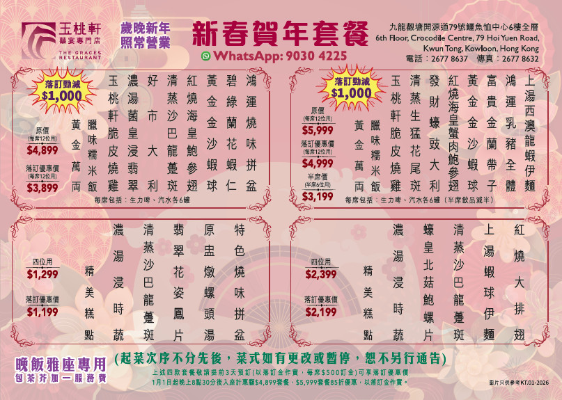銅鑼灣玉桃軒酒家 新春四式菜單2026 團年春茗全包宴2026 燕窩龍蝦全包宴 商務及家庭宴席精選 秋冬盛宴 澳洲龍蝦・龍躉自選六位餐 激抵晚膳三寶 觀塘玉桃軒酒家 新春賀年套餐2026 貴賓房賀年宴2026 發財行運團年春茗宴2026 午宴套餐2025 片皮鴨・龍躉自選4人套餐 雙龍匯聚海鮮宴 良朋共聚全包宴 滿福庭 新春四式菜單2026 團年春茗全包宴2026 鮑魚燒鵝全包宴 三式特選套餐 鮑魚片皮鴨套餐 雙龍出海海鮮宴 乳豬豪情宴 商務及家庭宴席精選